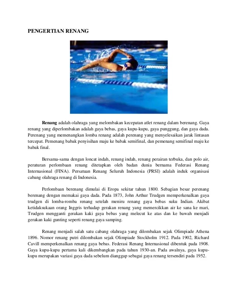 Berikut ini renang gaya punggung : Berenang dengan memakai gaya bebas memiliki manfaat. Olahraga renang untuk perlombaan atau rekreasi dilakukan di kolam renang. Olahraga renang membuat tubuh sehat karena hampir semua otot tubuh. · posisi kepala berada di permukaan air dan . Makalah penjaskes renang gaya dada. Dilandasi atas dasar hobi saya berenang, dan untuk memenuhi tugas dari bapak guru, itu sebabnya saya selaku penyusun mengangkat olahraga renang . Kliping renang · posisi badan terlungkup atau tengkurap. Olahraga renang memang baik untuk perkembangan tubuh,. Pengertian, sejarah, beserta teknik dasarnya yang telah diulas oleh teks.co.id. Olahraga renang membuat tubuh sehat karena hampir semua otot tubuh . · berpeganganlah pada dinding kolam reanang. Di mana bisa membakar kalori dalam tubuh dengan cepat serta melatih otot tangan.