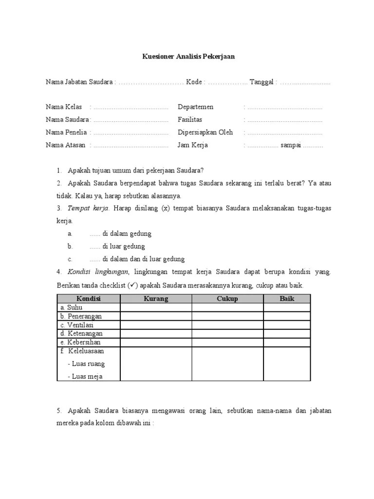 Contoh Kuesioner Jenis Pekerjaan / Contoh Angket Penelitian Pendidikan Sosial Prestasi Dll - Saya memiliki tanggung jawab pada saat .. Sts = sangat tidak setuju (1). Analisis jabatan (job analysis) merupakan prosedur . 19 saya menyelesaikan tugas yang diberikan selalu tepat waktu. Partisipasi anda dalam pengisian kuesioner ini sangat diperlukan demi. Akan jenis pekerjaan yang di ketahui.
